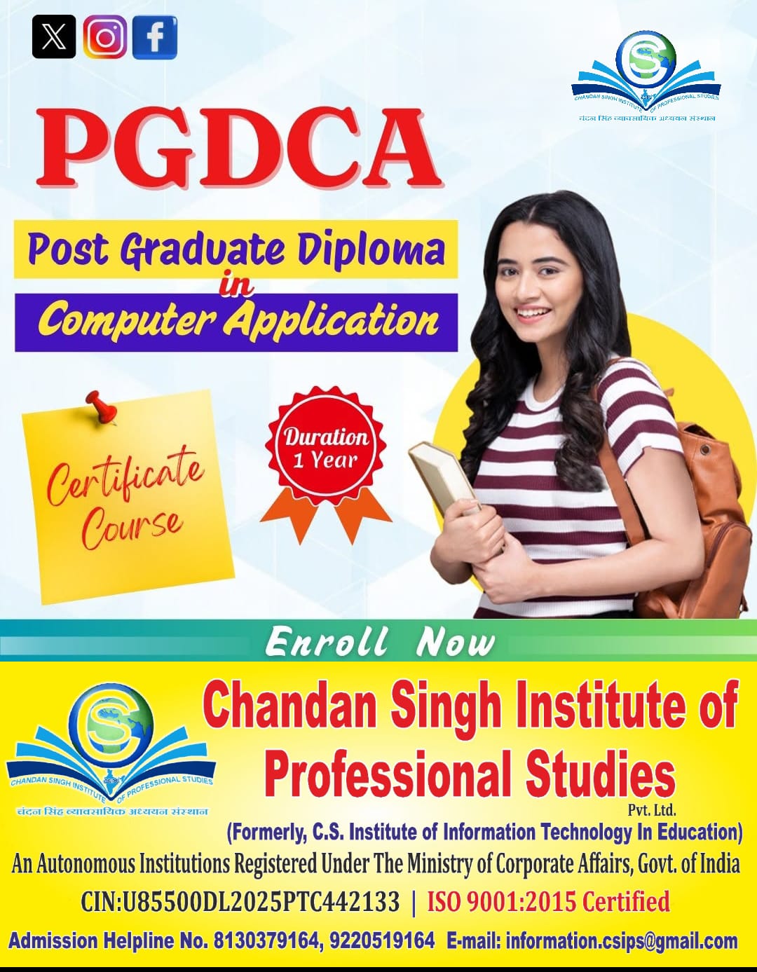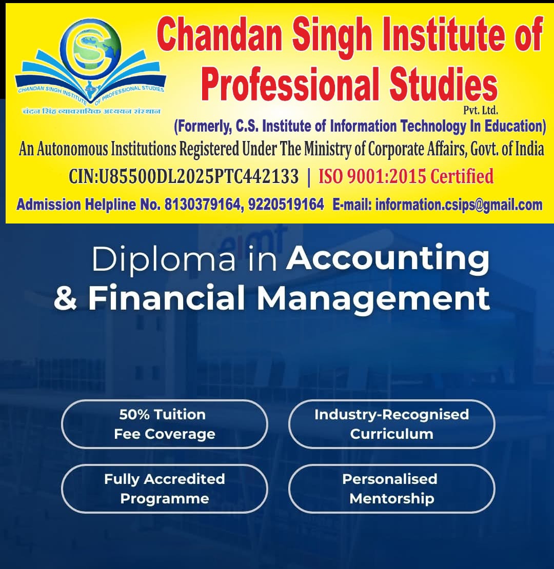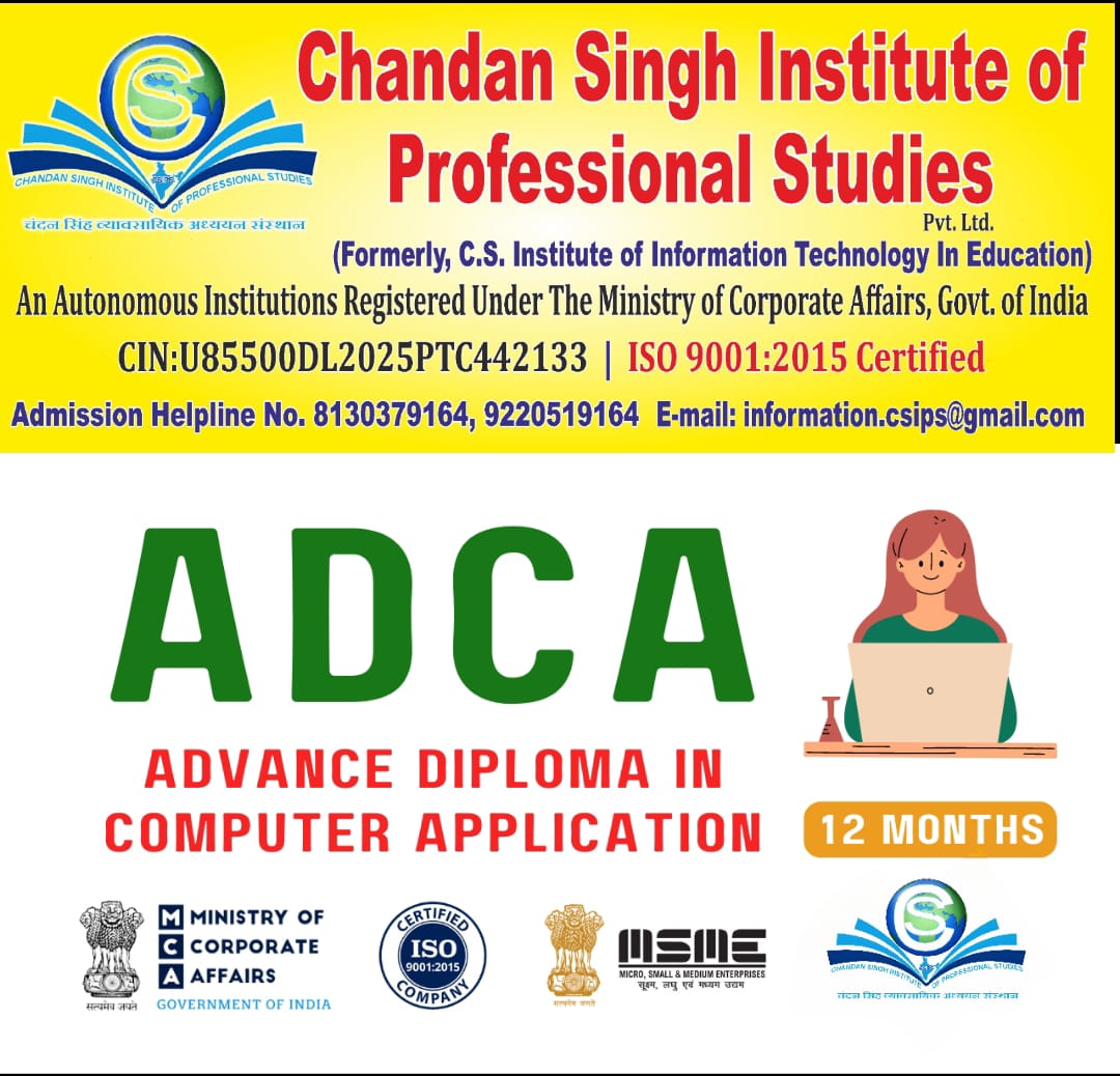 Chandan Singh Institute of Professional Studies” Private Limited (Formerly, C.S. Institute of Information Technology in Education) a NIELIT partner Company. CSIPS Pvt. Ltd. is AN ISO 9001: 2015 certified Organization Regd. By Ministry of Corporate Affairs, Govt. of India. Also certified by Ministry MSME, Govt. of India.